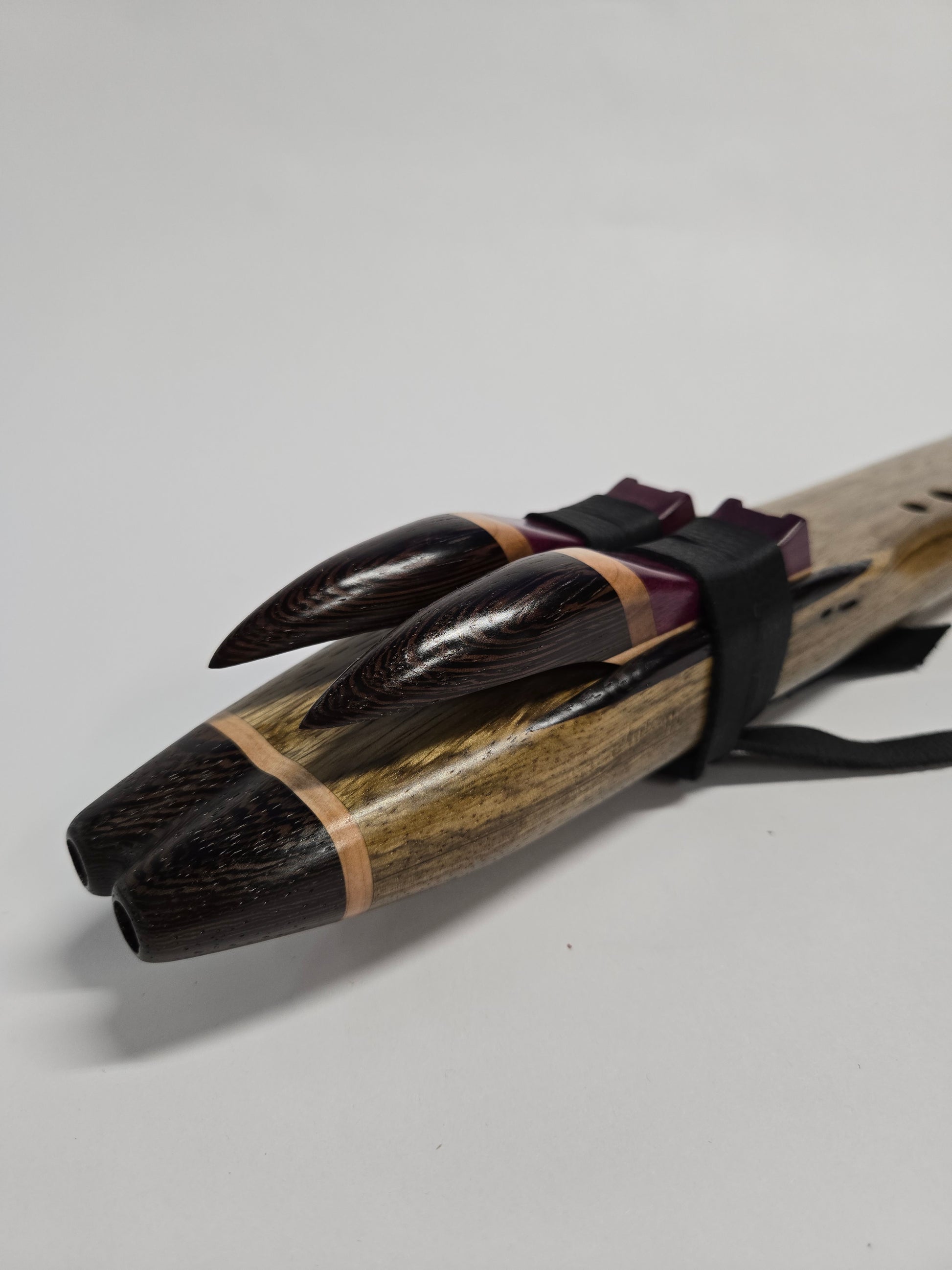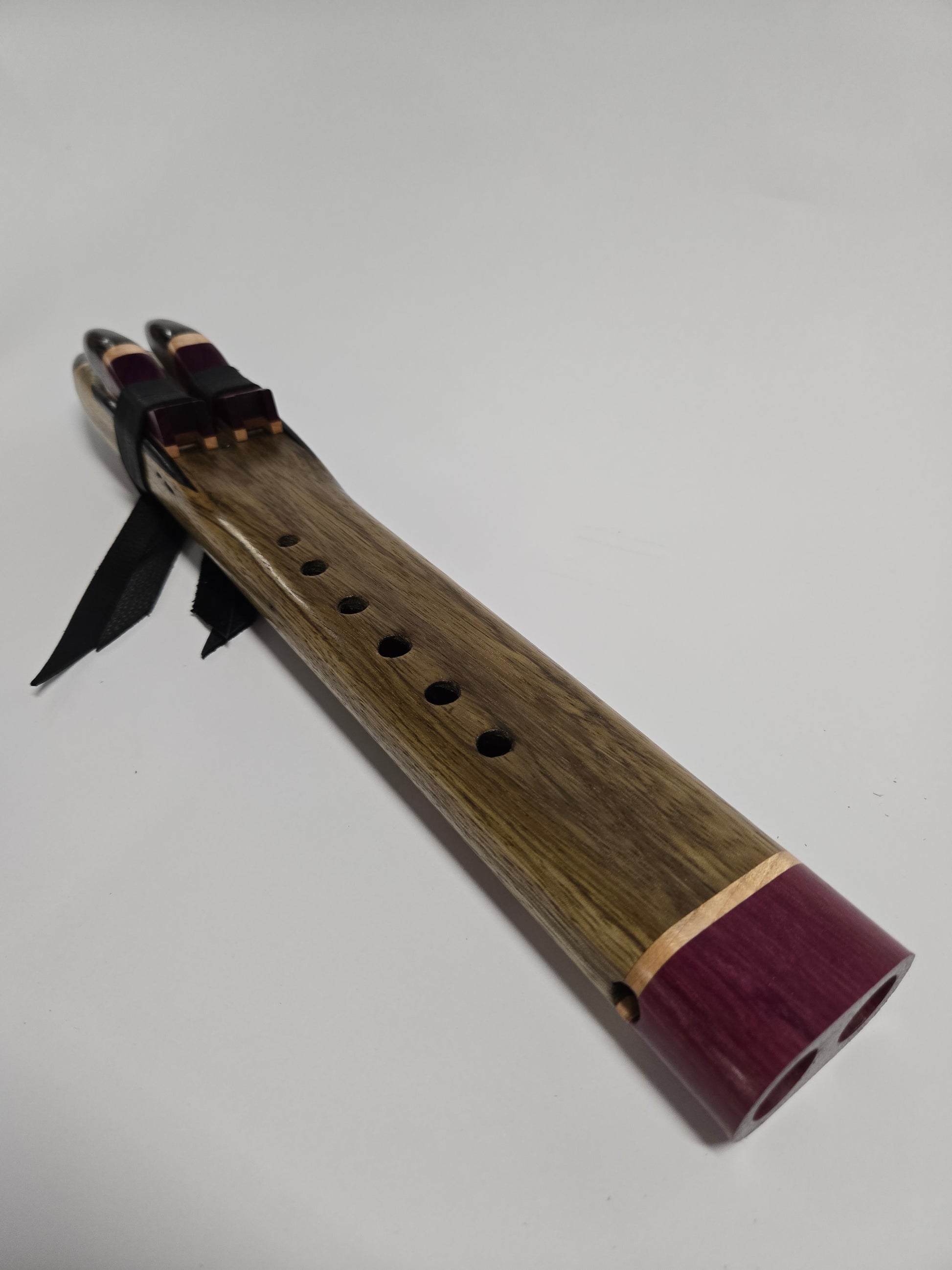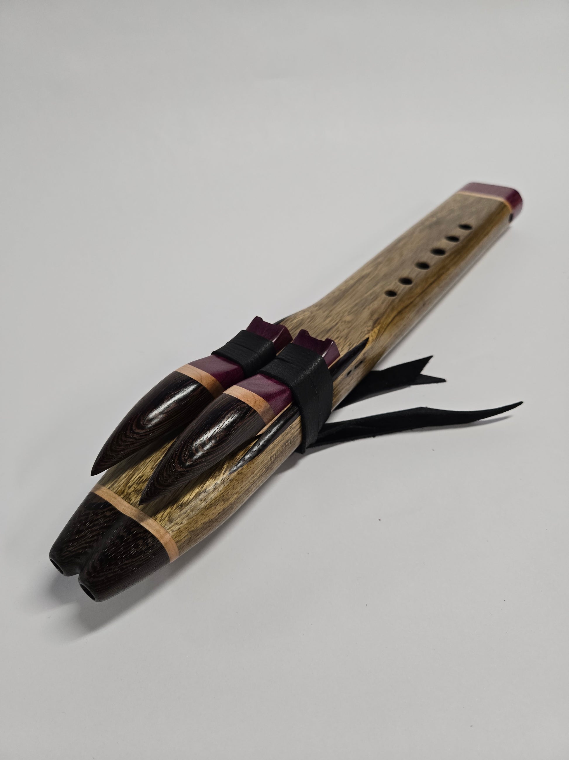 The mouthpiece and endcap are made out of purpleheart and Wenge, giving it a distinct look with a contrasting band of soft maple to tie it all together. Matching sound blocks (birds) as well.