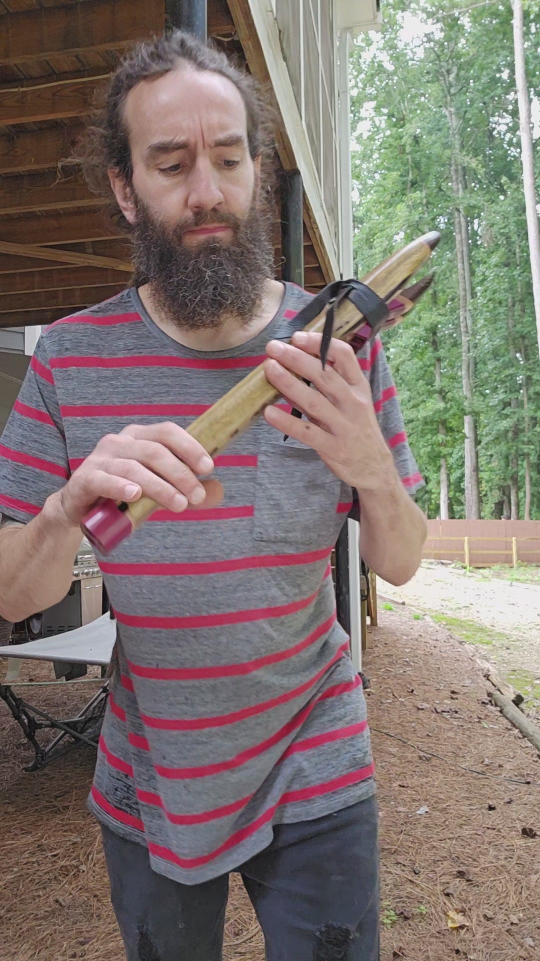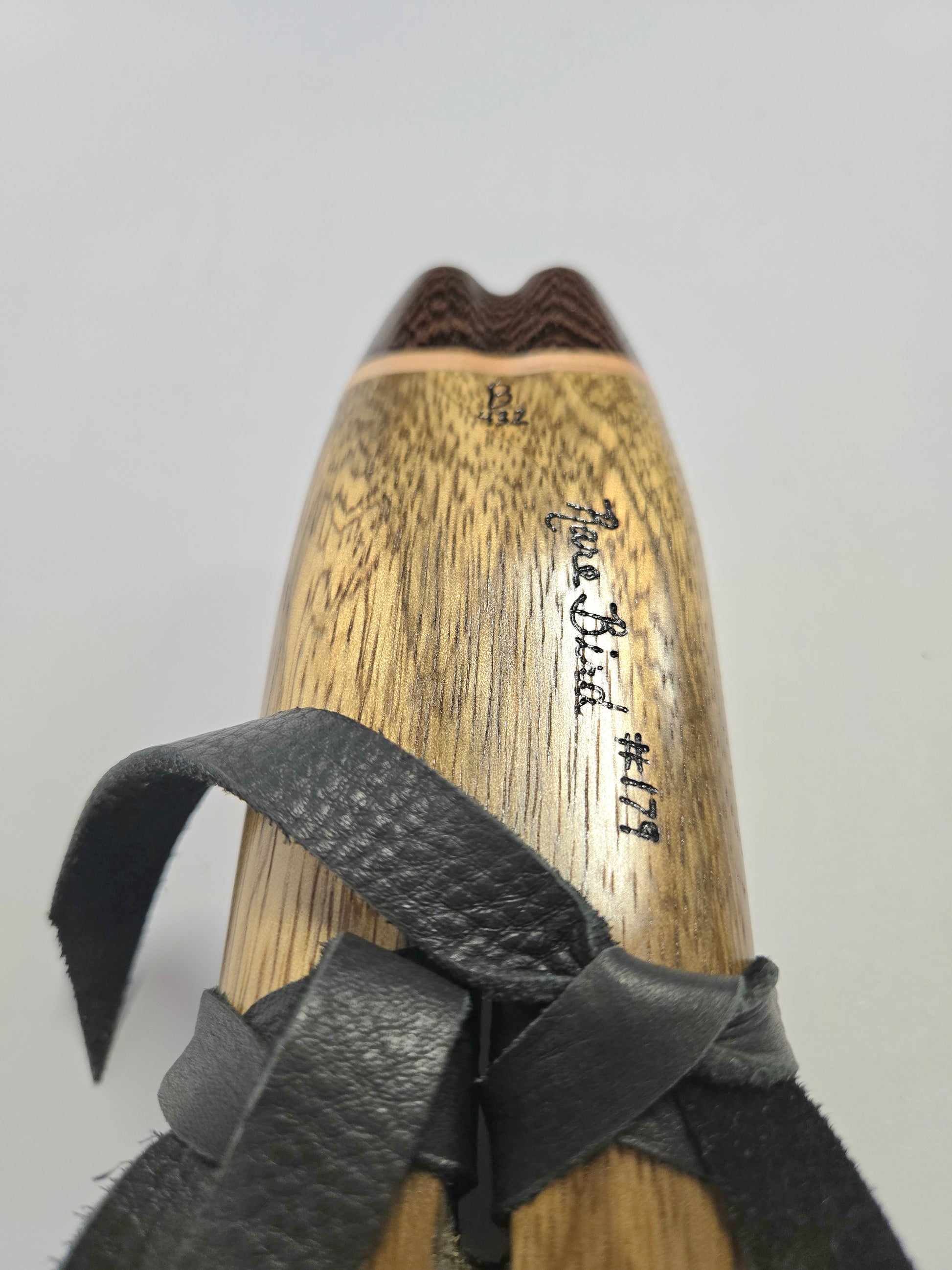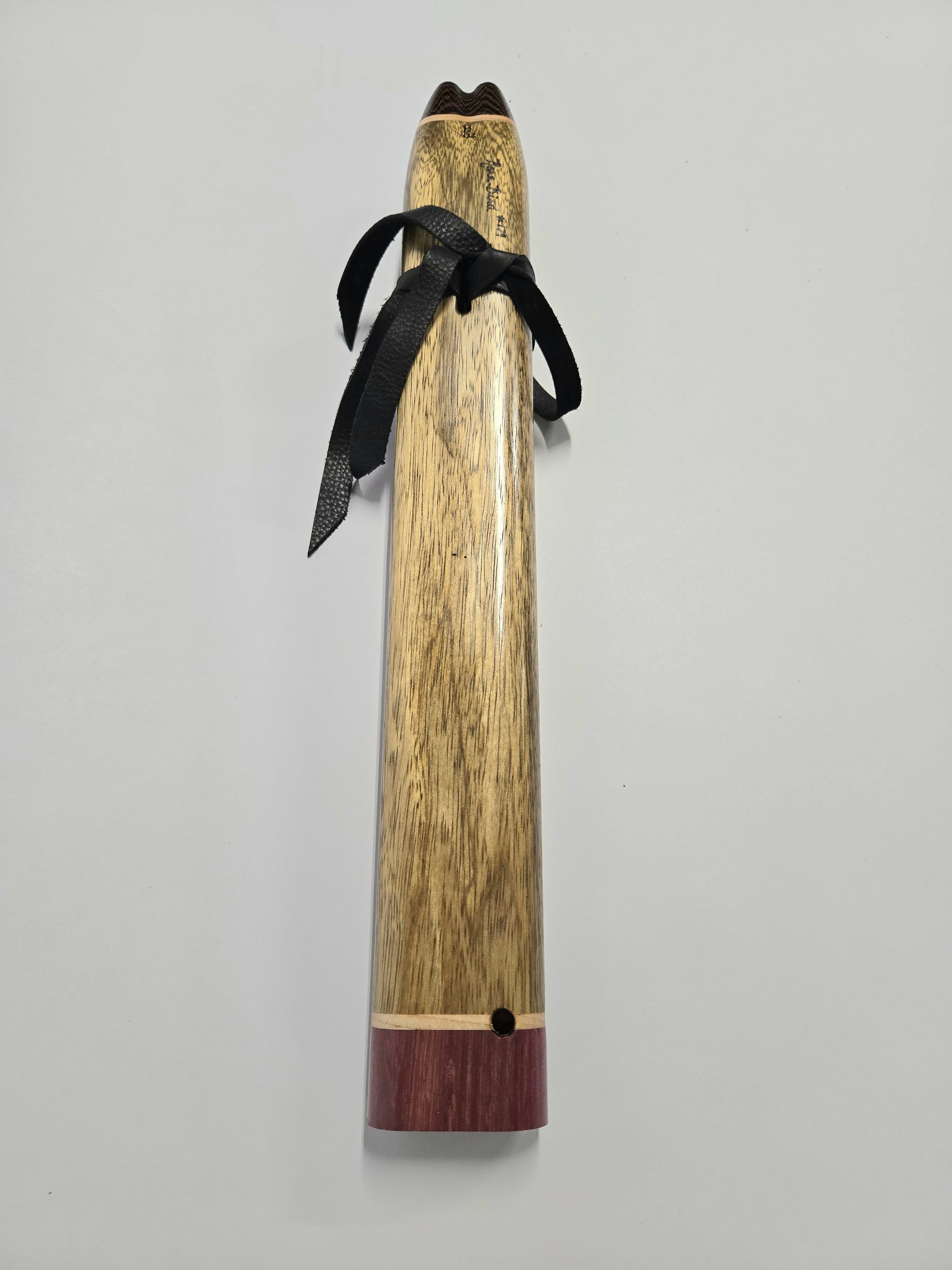 The mouthpiece and endcap are made out of purpleheart and Wenge, giving it a distinct look with a contrasting band of soft maple to tie it all together. Matching sound blocks (birds) as well.