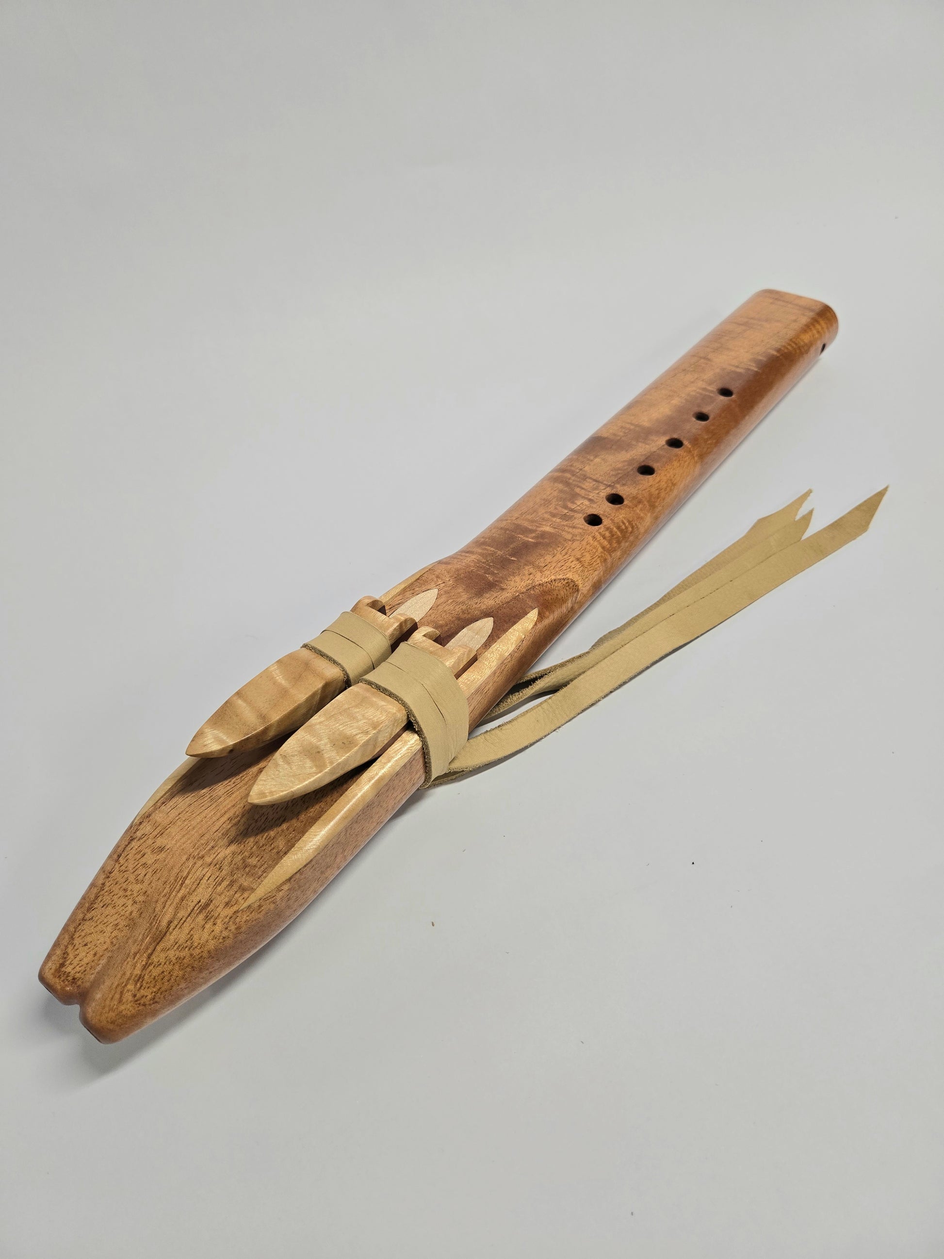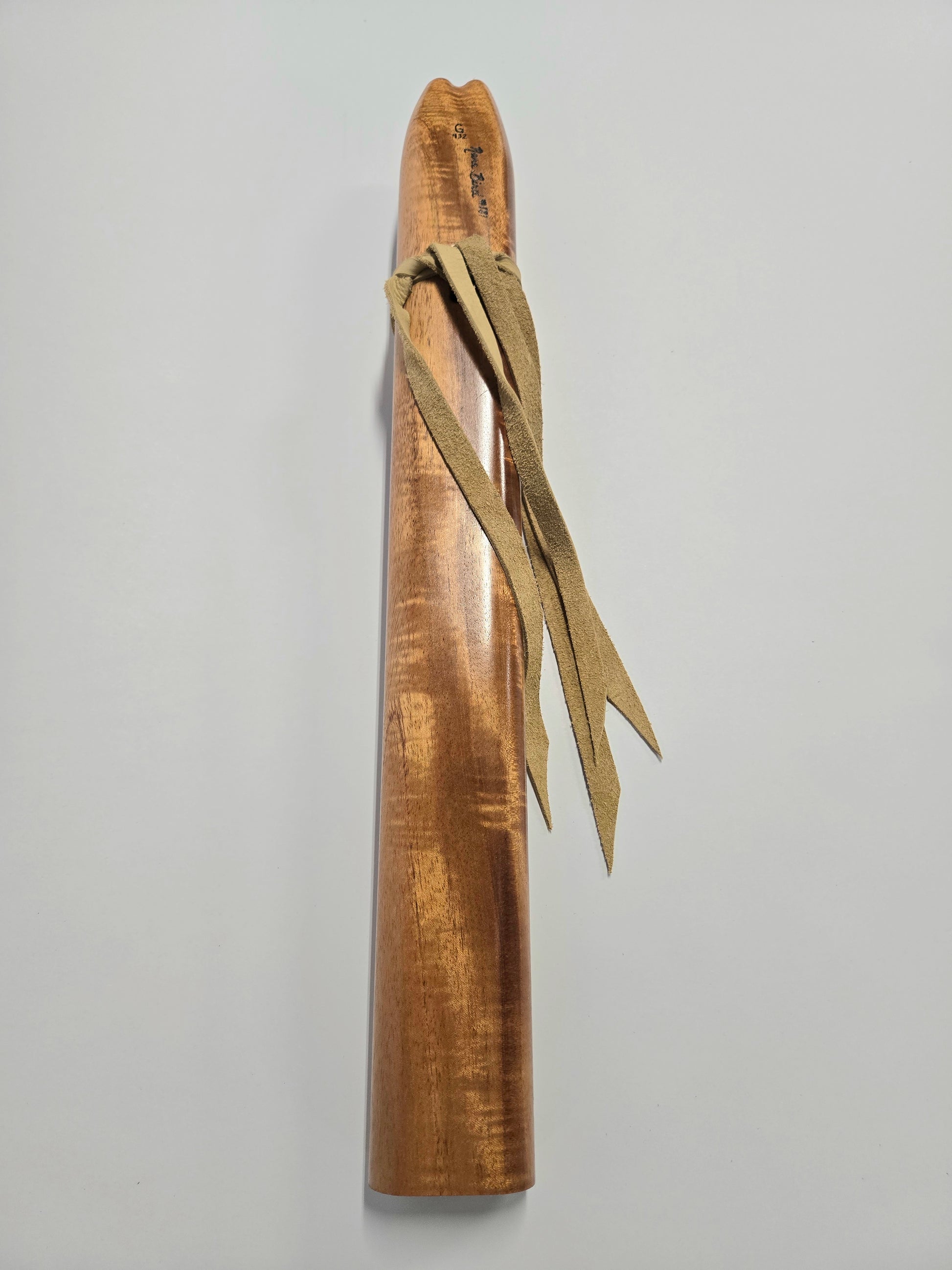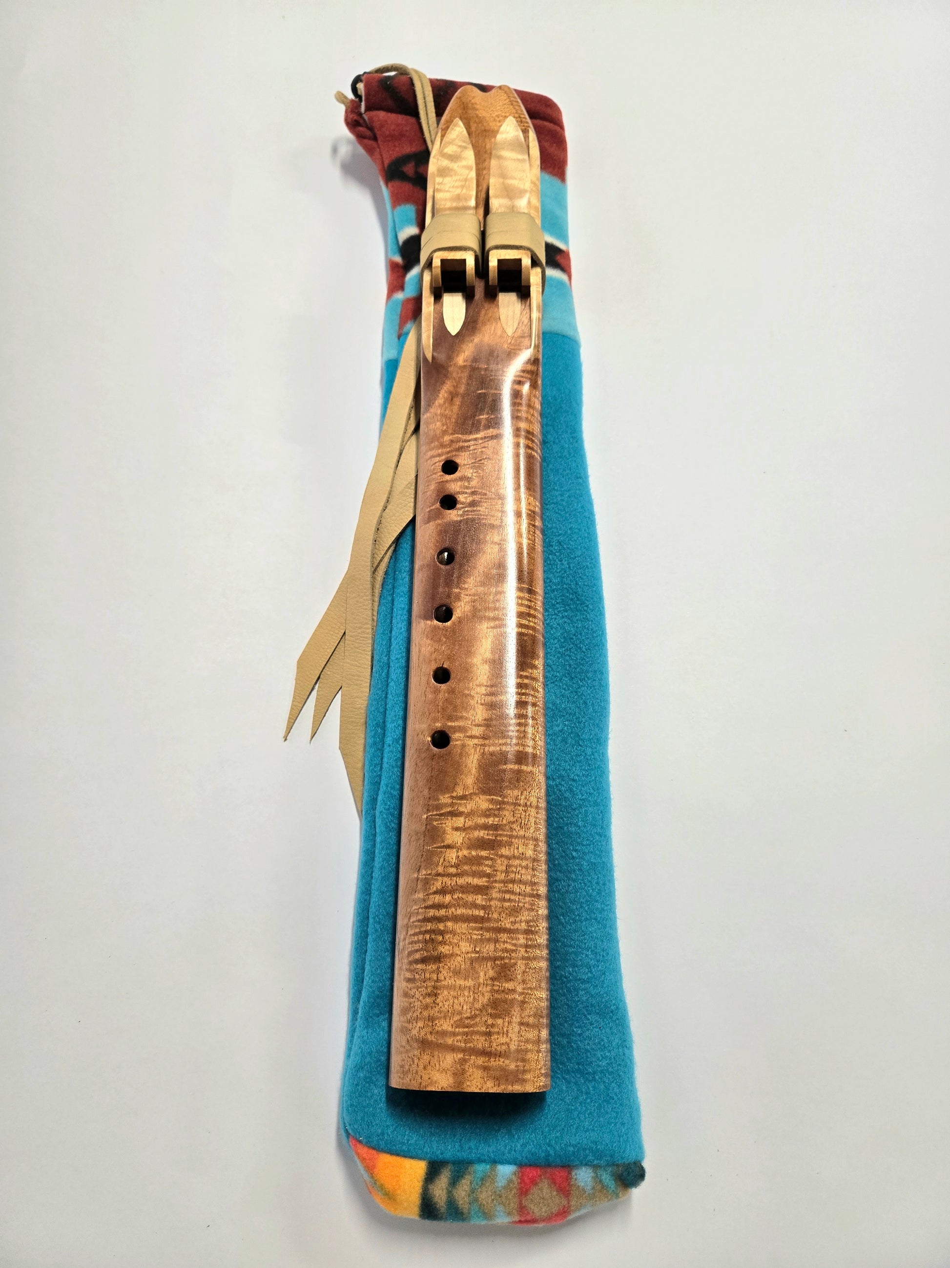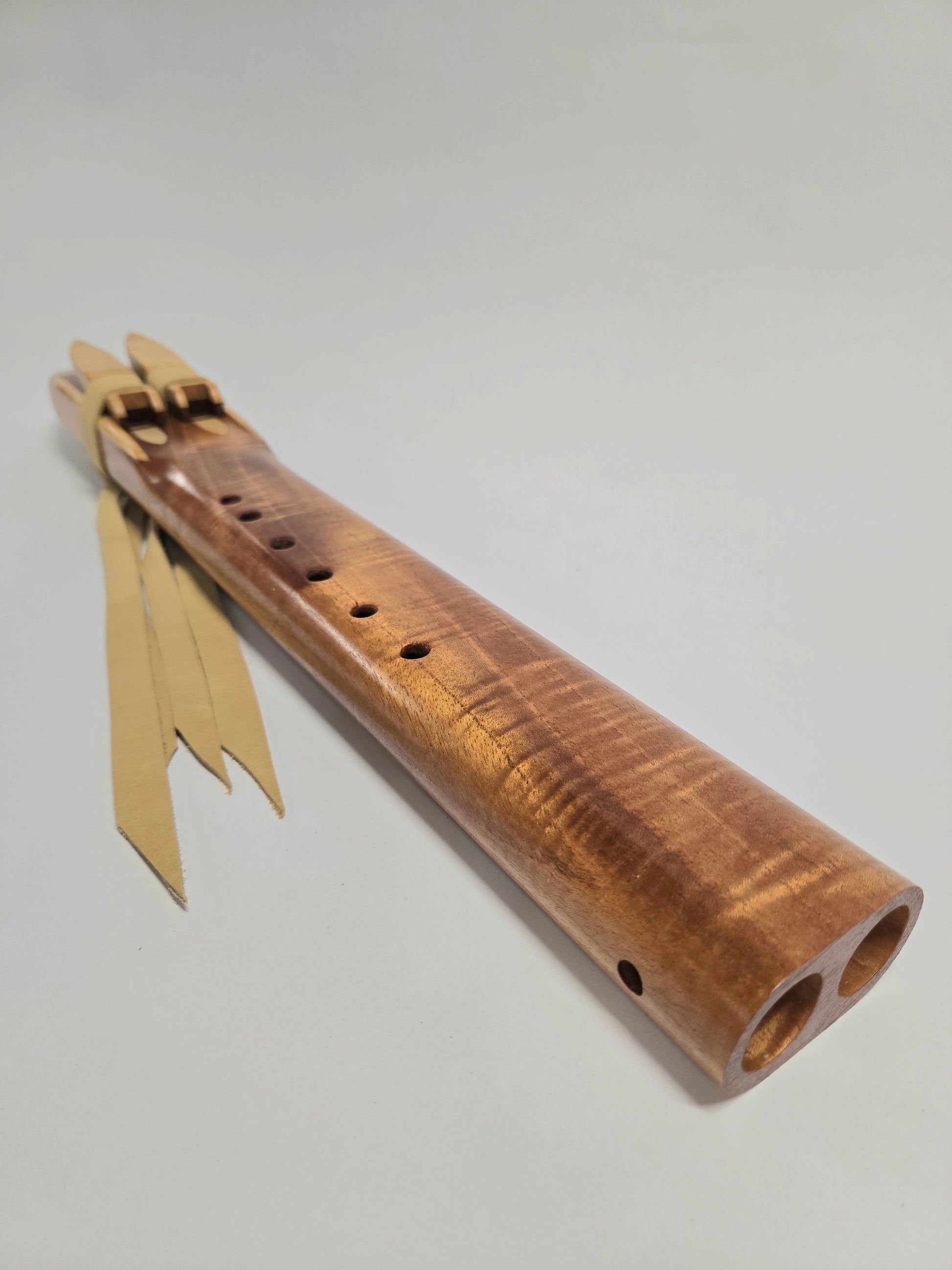 This flute is handcrafted out of Figured Spanish Cedar (body) aromatic cedar and Figured Camphor. What an amazing pairing of figured woods this flute has. And is equipped with a voice that is beautiful and mesmerizing to the player and listener.